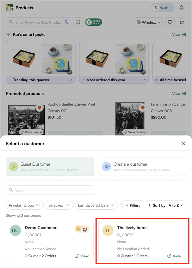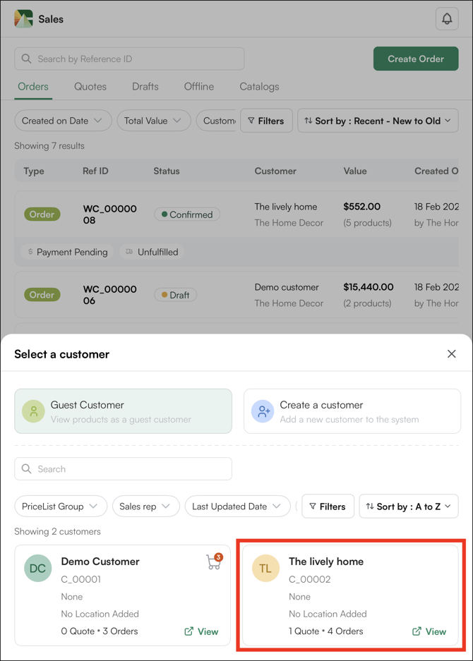 3. Select the Customer: Browse or search for the customer you want to create an order for.