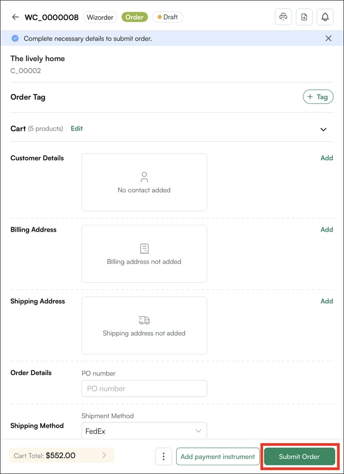 • Billing address, shipping address, and payment terms are pulled automatically from the customer profile when available