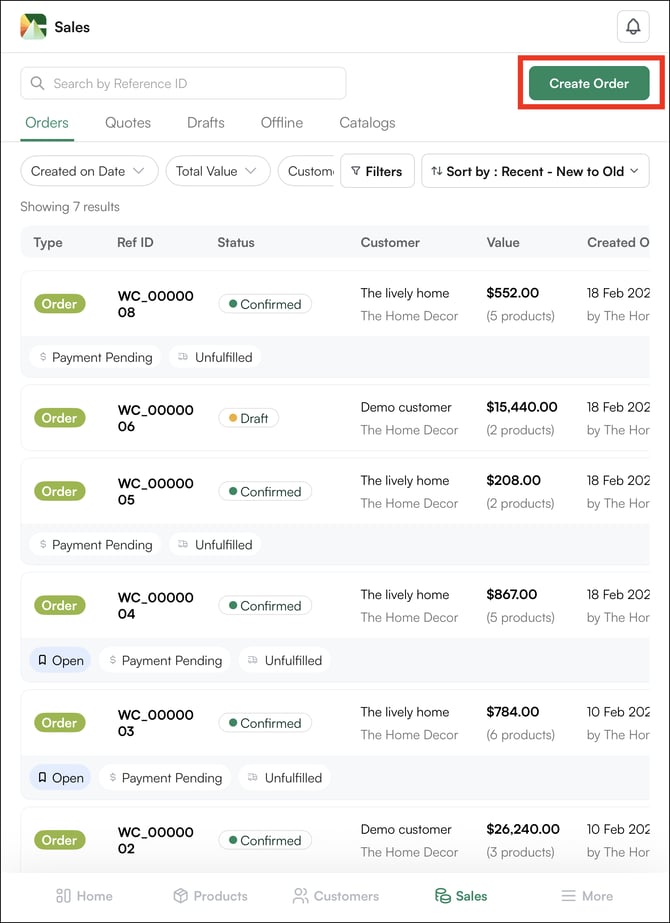 1. Click Sales from the bottom navigation (Sales Rep App).