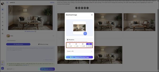 Note: Image generation is unlimited; credits are only charged when you download. Resolution affects credit cost: 1K costs 1 credit; 4K costs 2 credits; 8k costs 2.5 credits.