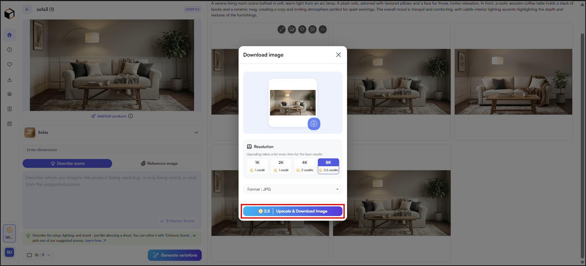 Click the Describe Scene box and type a custom scene description, or select from the AI-suggested scenes based on your product category