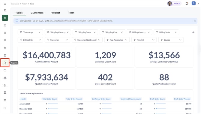The Reports section in WizCommerce gives you real-time visibility into how your business is performing, across sales, customers, products, and your team. Whether you're tracking revenue trends, identifying your top customers, or evaluating rep performance, everything is in one place. This article explains every metric available in each tab, how to use filters to slice the data, and what insights each report is designed to surface.